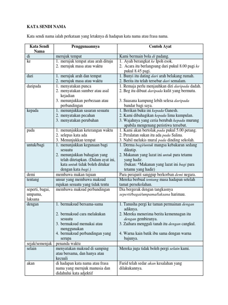 Kata sendi nama hanya hadir di hadapan kata namafrasa nama. Contoh ayat untuk peribahasa ini ialah. Biasanya kata nama merupakan nama bagi sesuatu objek orang tempat konsep.